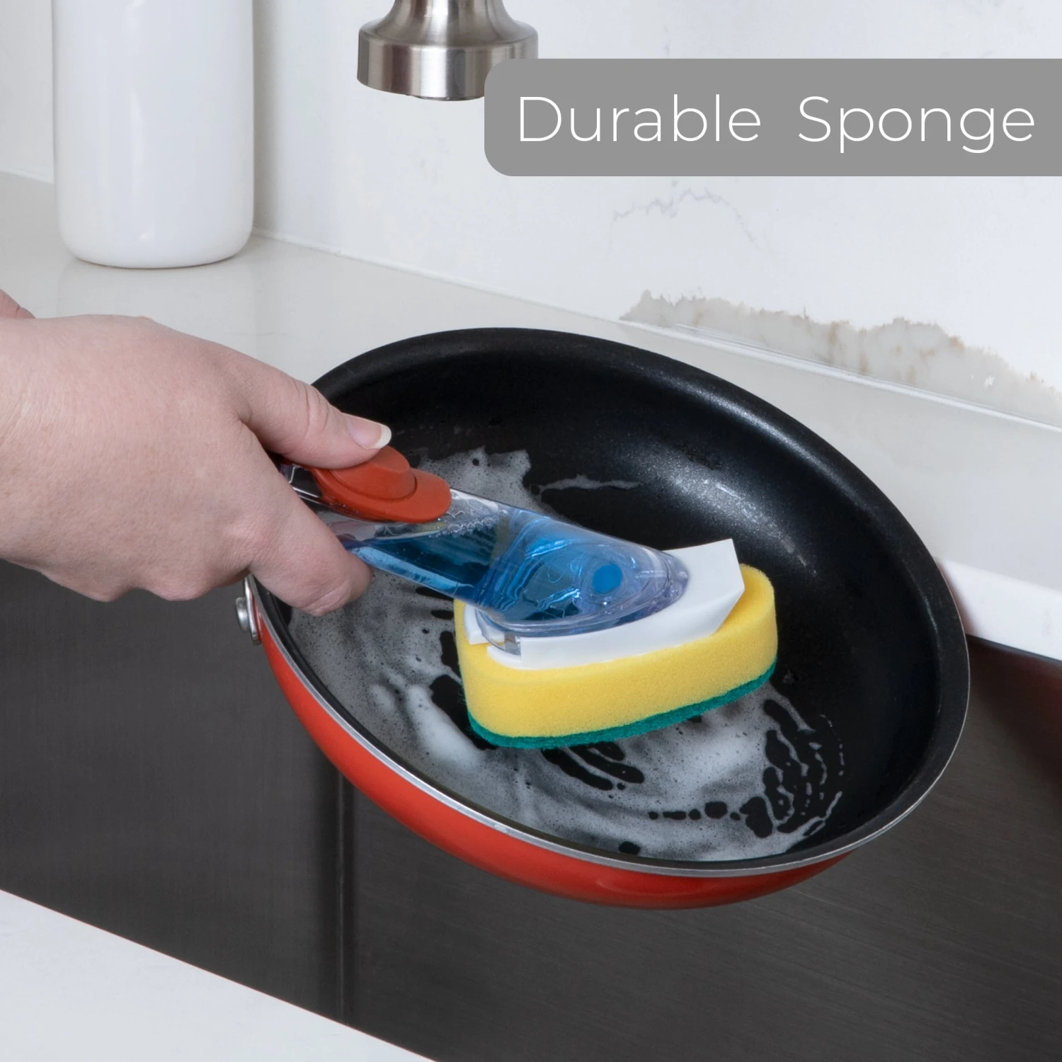 Sponge and scraper are safe for non-stick cookware and other delicate surfaces.
