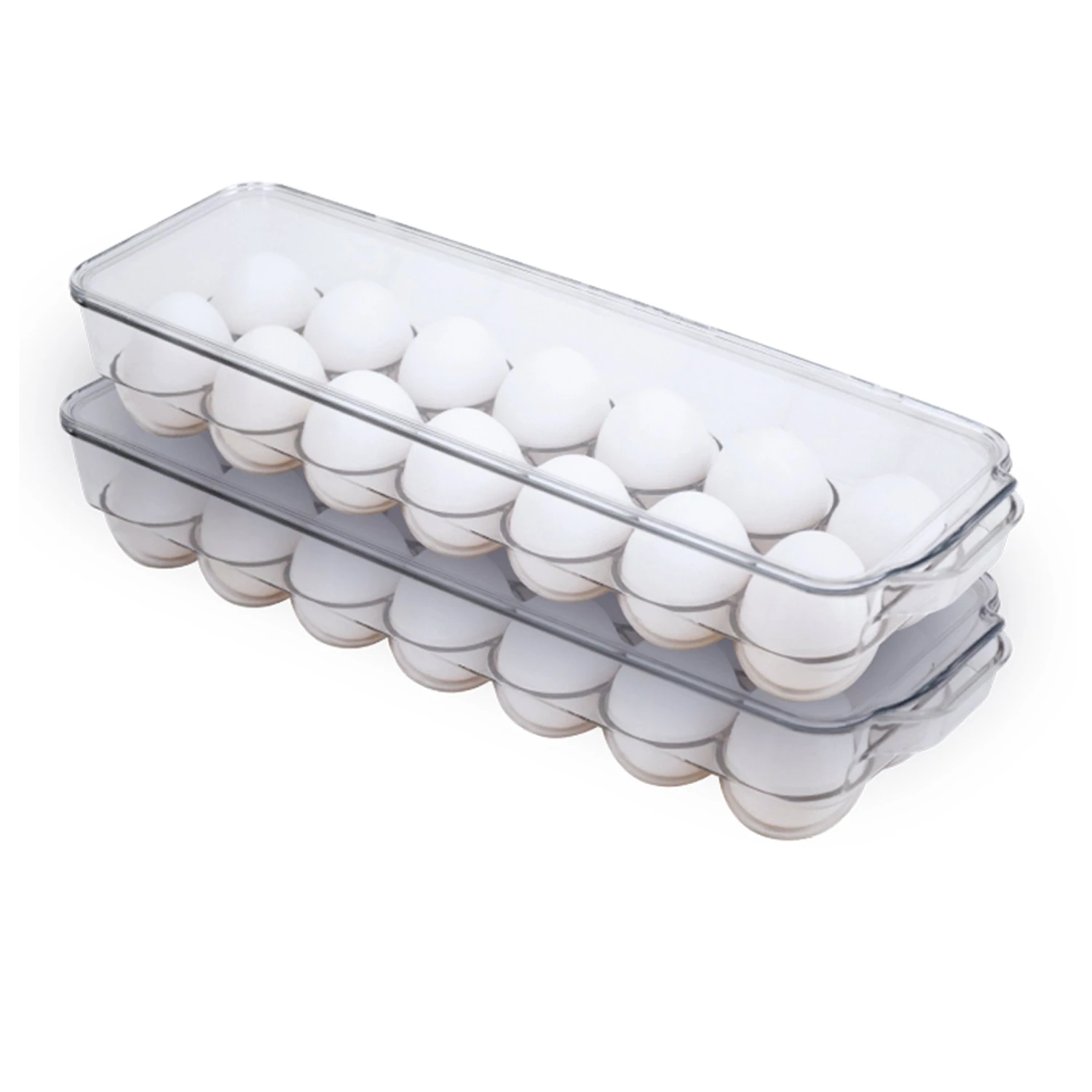 Organize your entire refrigerator and instantly create more space using this patented egg bin that holds 14 eggs.
